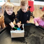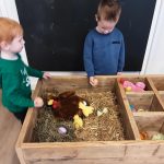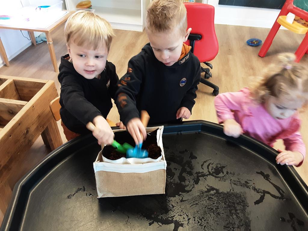Het boek ‘Dottie’s eieren’ stond eerst centraal en werd door de peuters nagespeeld. Ook zijn de kinderen alweer druk geweest met zaaien. Elke dag wordt er hoopvol gekeken of er al plantjes zichtbaar zijn!